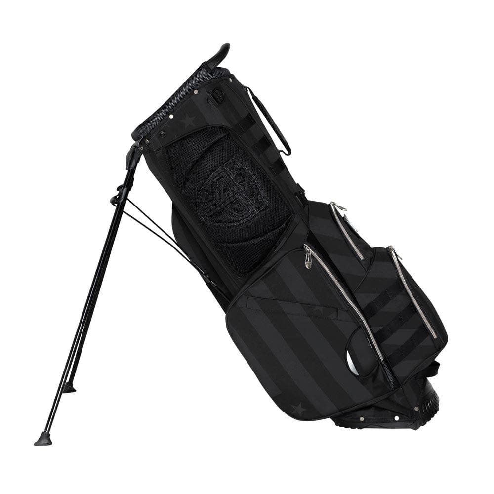 Exceptionally versatile whether you pack it or push it. the 4lb Covert Stand Bag is equipped with a feature set for either operation. When packing. the Subtle Patriot Strap automatically adjusts to custom fit any body type and continuously re-distributes the weight evenly to both shoulders. While strapped on. you’ll enjoy perfect access to your distance measuring device with a self-sealing security closure and an insulated hydration pouch. When pushing. the typical. impeding foot pedal is eliminated with the flex-foot base. providing a more stable fit on the cart. In either case. the hard shell. fleece line valuable pocket will protect your cell phone screen. electronics or other valuables from accidental damage. Don’t miss the hidden. padded carry pocket that allows extra protection for more private items and if 9 pockets aren’t enough. feel free to add storage through use of the Molle System.